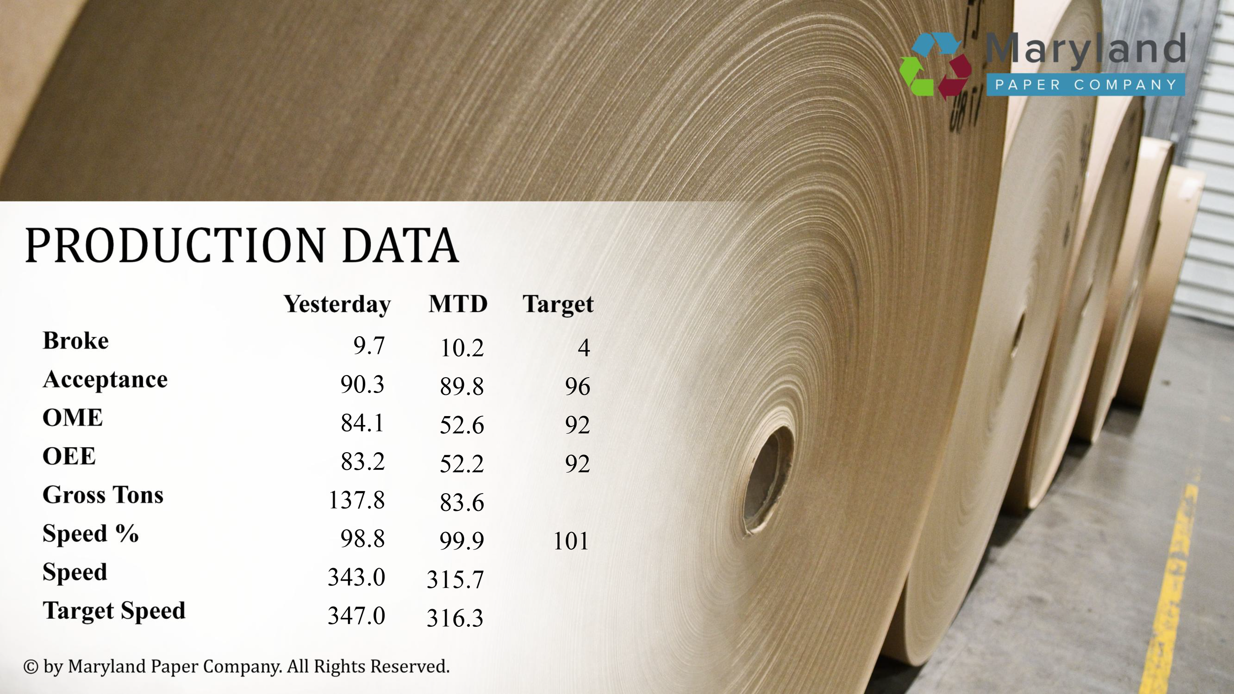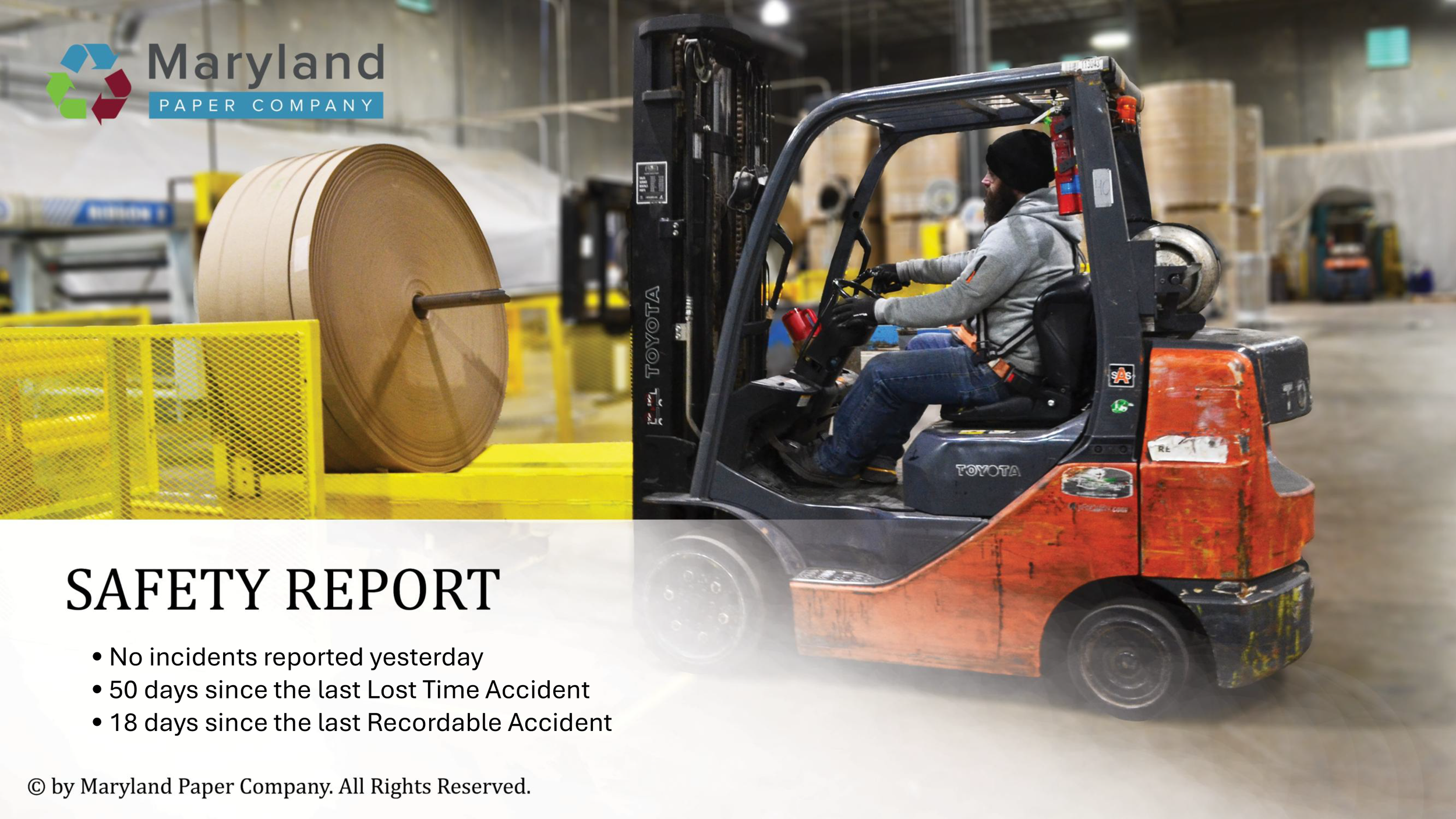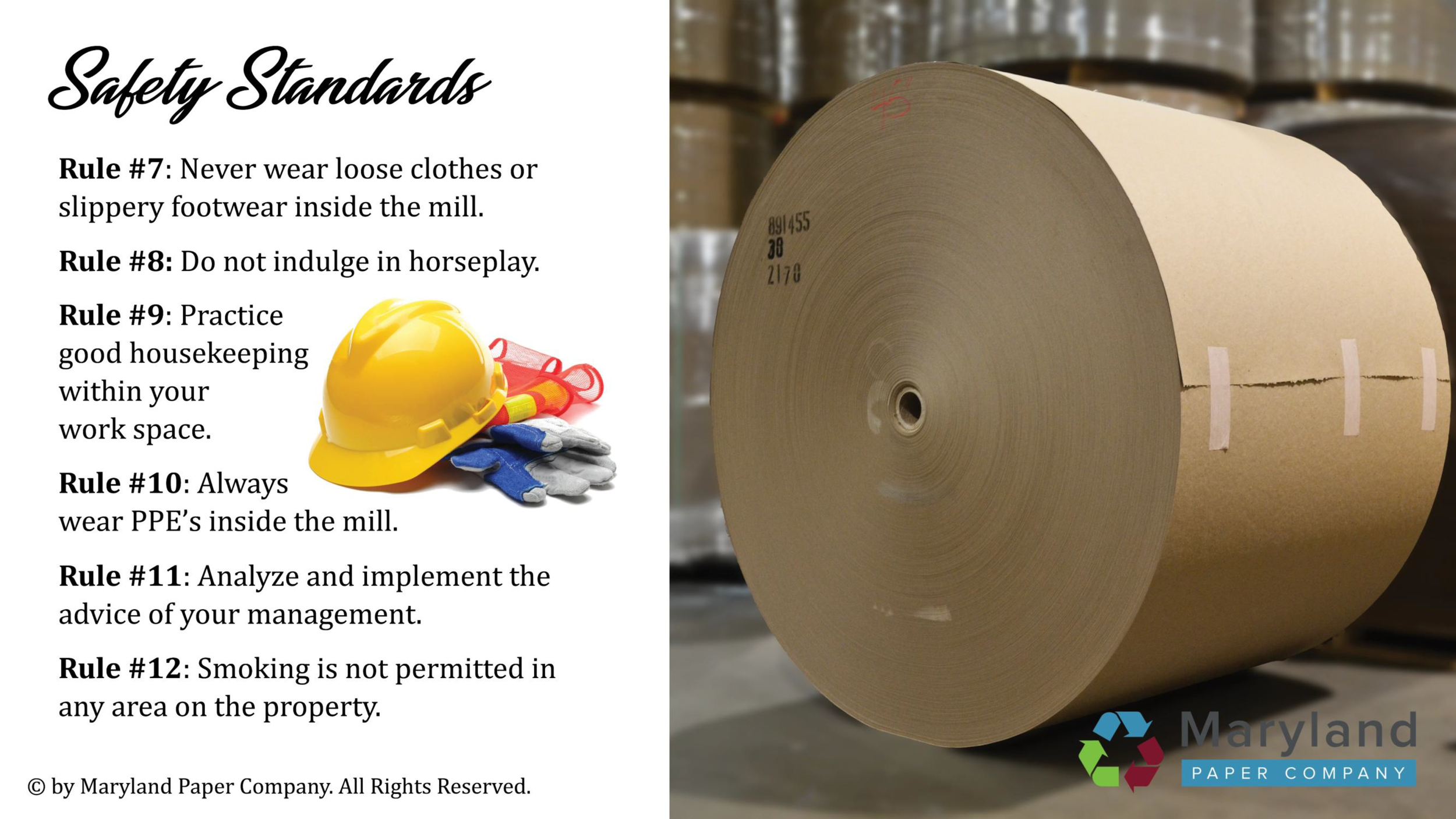 This presentation is utilized throughout the manufacturing facility at Maryland Paper Company, my current workplace. These displays are updated daily to enforce safety standards and production data. All photographs were personally taken and edited within Adobe Suite before being integrated into PowerPoint.