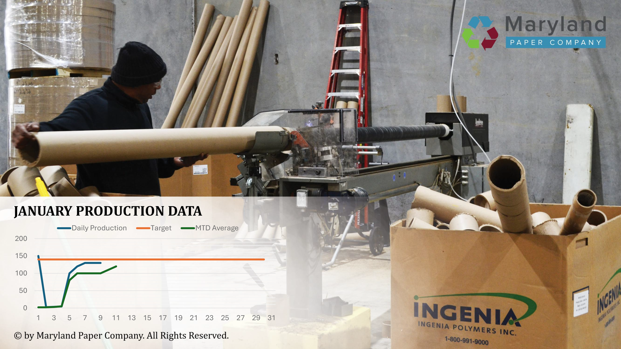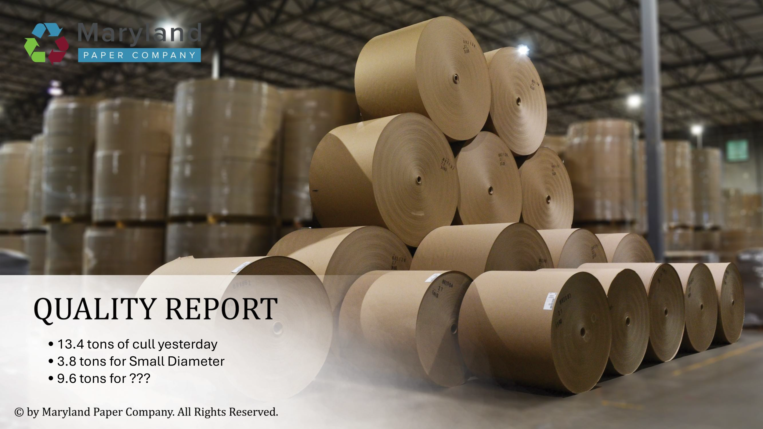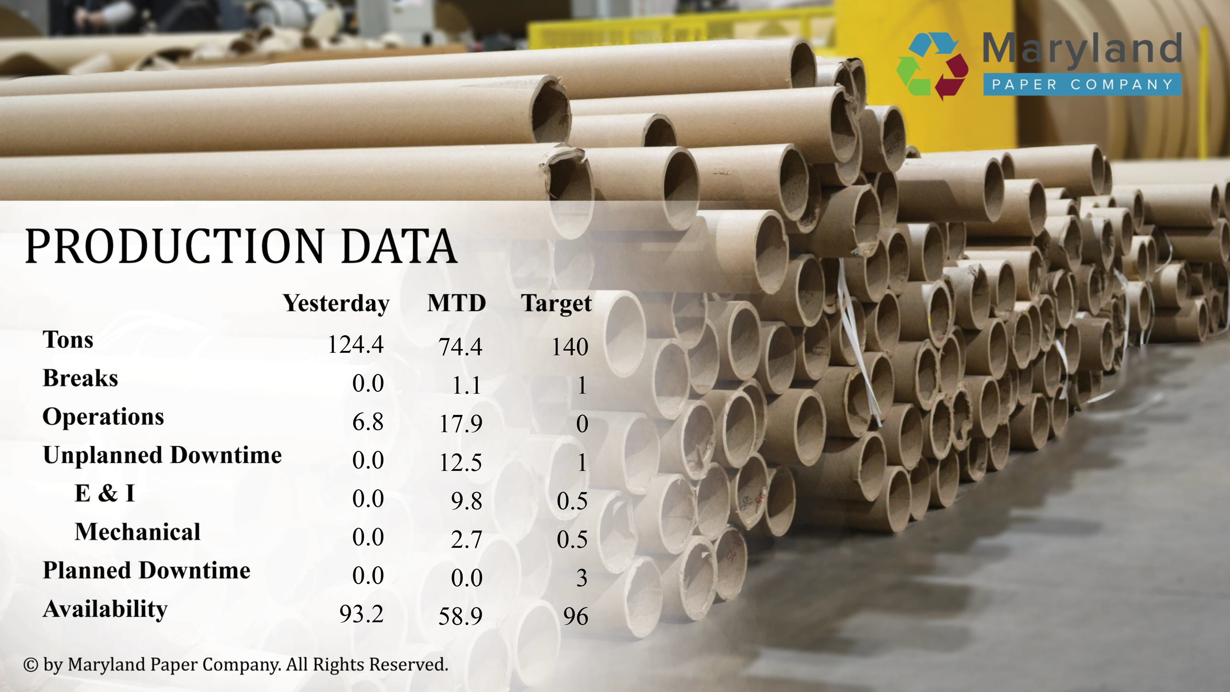 This presentation is utilized throughout the manufacturing facility at Maryland Paper Company, my current workplace. These displays are updated daily to enforce safety standards and production data. All photographs were personally taken and edited within Adobe Suite before being integrated into PowerPoint.